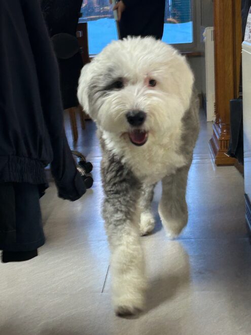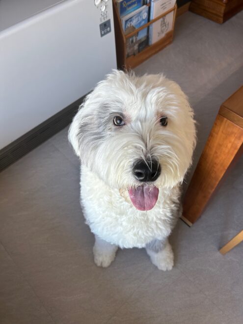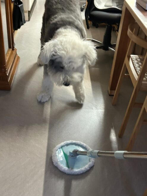 先週レオン君が事務所に遊びに来た時にモップと戦っていました(^O^)/